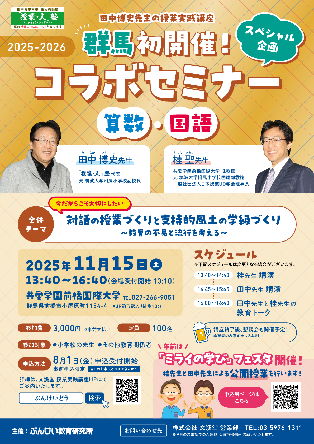 | 懇親会 | ★本講座終了後に、下記の通り懇親会を開催いたします。 日時:2025年11月15日(土)18:00頃 場所:前橋駅近辺 人数:25名程度(先着順) 料金:5,000円(当日集金) |